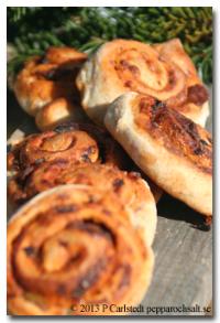 Gör så här:Deg: Blanda det ljumma vattnet med olja, jäst, salt och socker. Rör om tills jästen löst sig och rör i rågmjölet. Arbeta in 10 deciliter av vetemjölet och knåda länge. Gärna 10 minuter med maskin. Låt jäsa till dubbel storlek (30-45 minuter beroende på vilken temperatur luften runt degen har). Fyllning: Hacka de soltorkade tomaterna fint. Häll dem i en tekopp eller liten skål och häll det kokande vattnet över. Låt stå och svälla. Skala och hacka löken fint. Fräs den mjuk i lite matolja. Koka upp 2 deciliter vatten och blanda i tomatpurén och resten av ingredienserna. Rör även i de soltorkade tomaterna och låt koka ihop några minuter till en tjock sås. Stjälp upp degen på bakbordet. Knåda den så att luften går ur och dela i två bitar. Kavla ut till var sin rektangel, stor som en bakplåt ungefär. Bred på fyllningen. Pensla lite vatten på ena långsidan, detta kommer att fungera som lim när du rullar ihop degen. Rulla ihop degen som en rulltårta. Dela varje rulle i 2 till 3 centimeter breda skivor. Lägg dem på bakplåt med bakplåtspapper. Grädda i 225 grader mitt i ugnen i 10-12 minuter. ![]()
